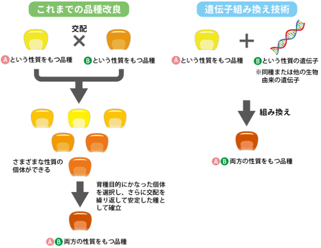 わかりやすく言うと、遺伝子組み換えは品種改良の進化バージョンです。